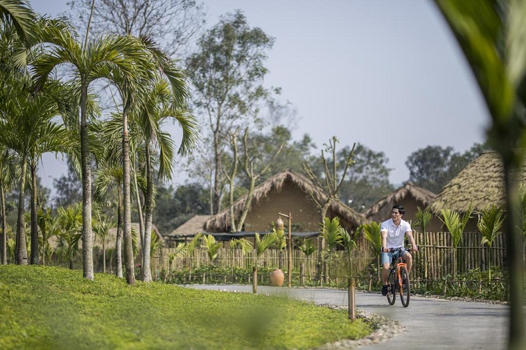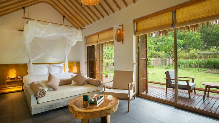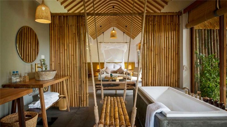 Phòng bungalow ở khu nghỉ dưỡng có diện tích lên đến 110 m2 được thiết kế độc đáo và ấn tượng. Nội thất trong phòng đều được chế tác bằng gỗ, đá, tre… tạo cảm giác rất gần gũi, tôn vinh nghệ thuật thủ công tinh xảo và khéo léo của nghệ nhân Việt. Các phòng rất nổi bật bởi tông màu trắng sữa kết hợp với màu vàng dịu mang đến cảm giác mát mẻ và thư giãn tối đa cho du khách…