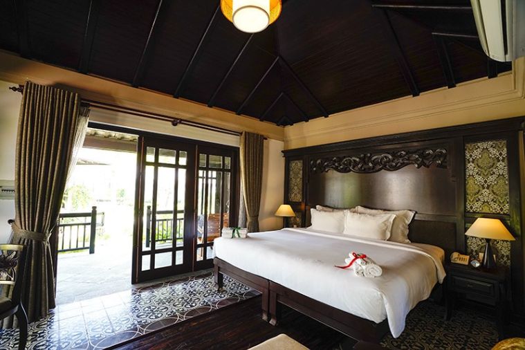 Nằm trong khu Bungalow có nhiều phòng nhất, phòng Deluxe Garden sở hữu 2 giường đôi cỡ Queen với diện tích 50m2 và có nhiều ô cửa sổ, cửa ra vào bao quanh với vườn cây và thảm cỏ xanh bao xung quanh nên vừa tạo cảm giác thanh bình nhưng rất dễ chịu và thư thái cho các cặp đôi. Nội thất phòng cũng theo sát tông chủ đạo của khu nghỉ dưỡng với gỗ nâu đen trầm ấm cùng gạch bông cổ điển.