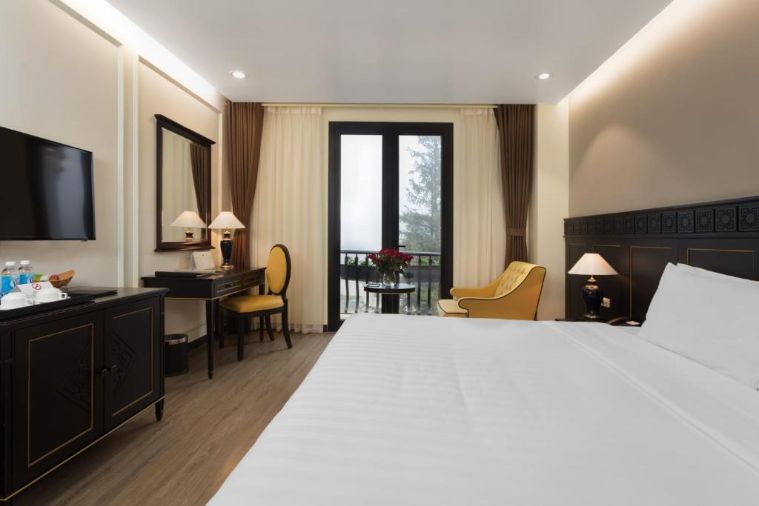Diện tích căn phòng vào khoảng 45 mét vuông, được trang bị một giường đôi và có ban công nhìn ra thị trấn Sapa. Ngoài ra trong phòng còn bố trí thêm một chiếc sofa đối diện giường, rất êm ái, phục vụ du khách ngồi ngắm cảnh hay bàn bạc công việc.