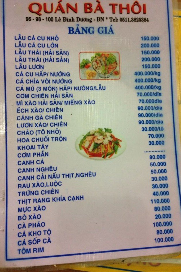 2. Hải sản bà Thôi 1: 98,100,102 Lê Đình Dương – Hải Châu, ĐT: 05113 825 384; quán Hải Sản Bà Thôi 2: KDC Mở Rộng 2 – Đường Hoàng Sa – Sơn Trà, ĐT: 0905 055 511