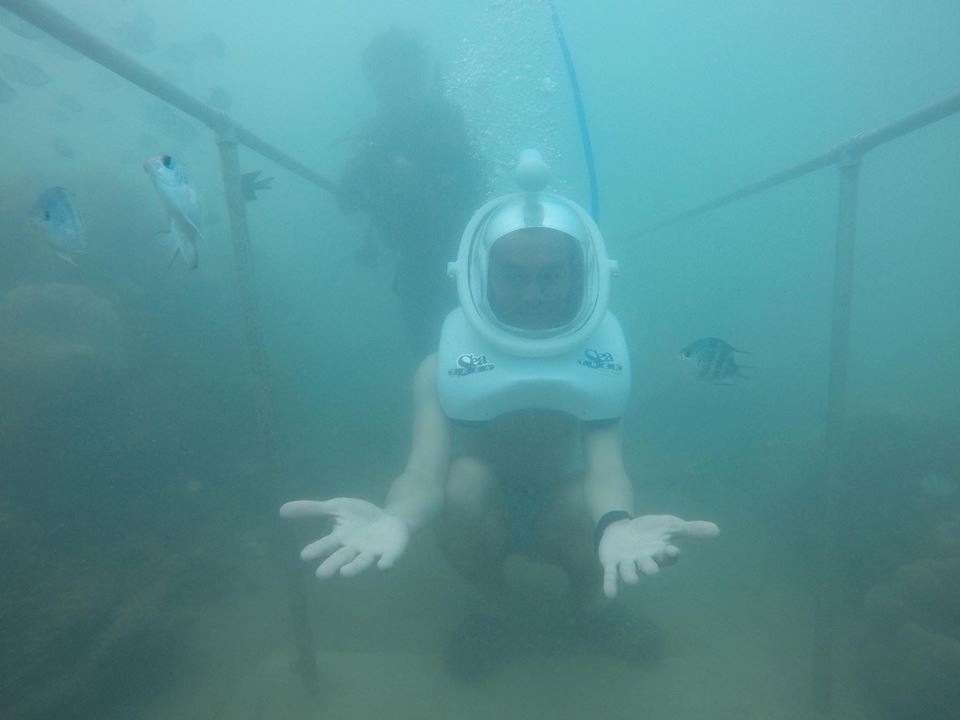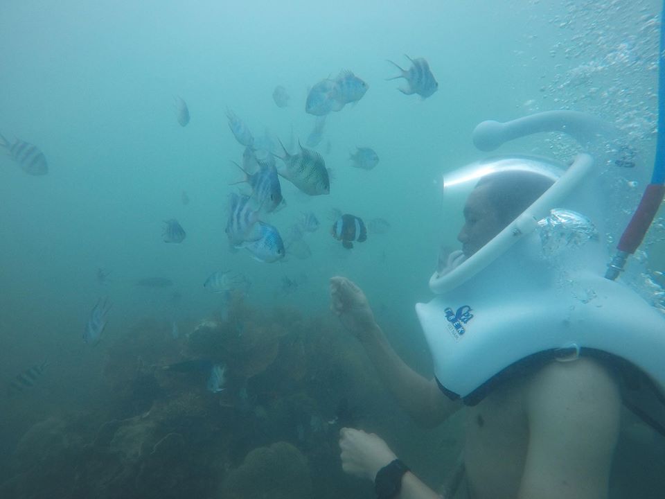 “Vì bạn nữ không biết lặn nên dịp này bọn mình chơi trò đi bộ dưới biển – Sea trek. Trò này ở tây rất phổ biến còn ở ta thì khá mới. Ai cũng chơi được mà không cần biết bơi hay biết kỹ năng lặn. Bạn nữ khoái lắm vì còn không bị ướt tóc nữa. Họ chụp 1 cái mũ như phi hành gia lên đầu thế là thở bằng mũi thoải mái, lại quan sát ngắm san hô rất dễ dàng. Cá nhiều vô kể, xem clip thì các bạn sẽ thấy. Bọn mình mang theo ít bánh mì thế là cá bu cả đàn xung quanh, tha hồ chụp ảnh. Bên tổ chức tour lại cho mượn gopro để mình quay nên rất tiện. Bạn nào không biết quay chụp thì họ cũng chụp cho và gửi mail để khách lưu lại. Nói chung với hơn 1tr/ người mà bao gồm cả xe đưa đón từ Đà Nẵng hoặc Hội An, ca nô cao tốc, ăn trưa, đi bộ dưới biển là quá rẻ và dễ chơi so với món lặn biển.” _Na Sơn_
