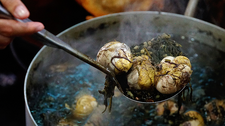 Đến bữa xế, nếu thấy đói rồi thì có một vài món ăn vặt chắc chắn bạn sẽ rất hài lòng. Tiết hầm lá ngải - trứng vịt lộn là một trong những đặc sản Hạ Long được nhiều người sành ăn giới thiệu. Độ ngọt từ những miếng tiết góp phần làm cho lá ngải cứu dịu vị đắng hơn, còn lá ngải thì giúp tiết không còn bị tanh. Mỗi khi bạn gọi một bát tiết hầm lá ngải thì sẽ đi kèm 1 quả trứng vịt lộn. Món ăn bổ dưỡng này có giá thành khá rẻ, chỉ khoảng 10.000 - 20.000đ.