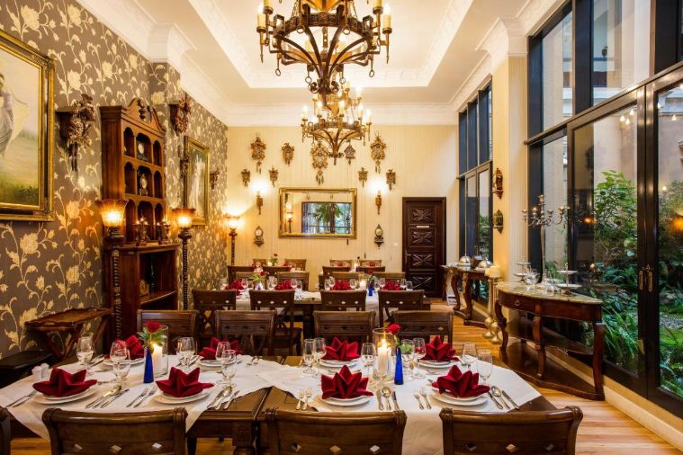 Với phong cách hướng cổ điển được gọi là “Black Forest”, những phòng ăn trong nhà hàng còn được trang trí bằng giấy dán tường hoa lá nhẹ nhàng, cùng với đó là những chiếc kệ gỗ cổ, bức tranh Phục Hưng hấp dẫn và đồng hồ cơ khí cổ của Đức, các mẫu đồng hồ Schwarzwalder-kuckuck cổ điển đến bất ngờ. Nhà hàng còn phục vụ các bữa ăn buffet hay tiệc nướng BBQ vô cùng hấp dẫn.