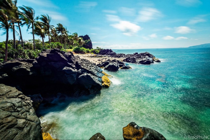 Rặng dừa xanh, gành đá đen và dải cát trắng bên biển xanh mùa ngọc bích - Ảnh: Dong Bui