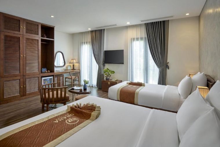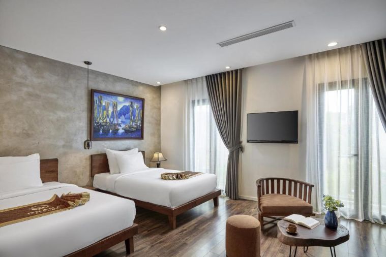 Với diện tích 23m2, phòng được đặt 2 giường đơn và có một phòng tắm riêng biệt. Căn phòng được thiết kế những chiếc cửa lớn đón ánh sáng tự nhiên ngập tràn, được trang bị những đồ nội thất hiện đại như tủ quần áo, bàn trang điểm, bàn trà, tủ đồ cá nhân,…Phòng tắm có vòi tắm đứng, được lát đá hoa văn bắt mắt và cũng là điểm nhấn ấn tượng cho du khách.