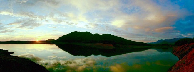 Ráng chiều trên lòng hồ. Đến đây bạn có thể thả hồn theo những áng mây lảng bảng ấp ôm bên đảo nổi.