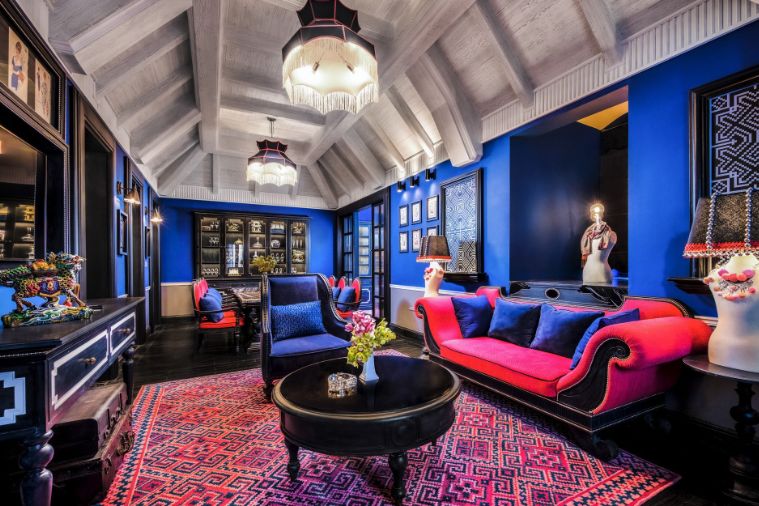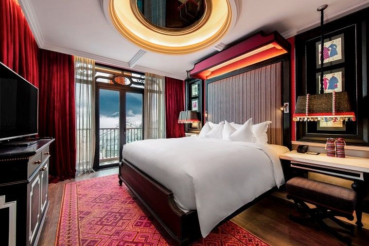 Căn phòng nổi bật với màu sắc mê mị và lôi cuốn của màu đỏ từ đá Ruby kết hợp với hoa văn trên trang phục dân tộc mông tại Sapa. Giữa phòng được trải một tấm thảm lớn thêu họa tiết thổ cẩm cùng với đó là nội thất với tông màu đen, đỏ làm cho căn phòng vừa tinh tế vừa sang trọng.