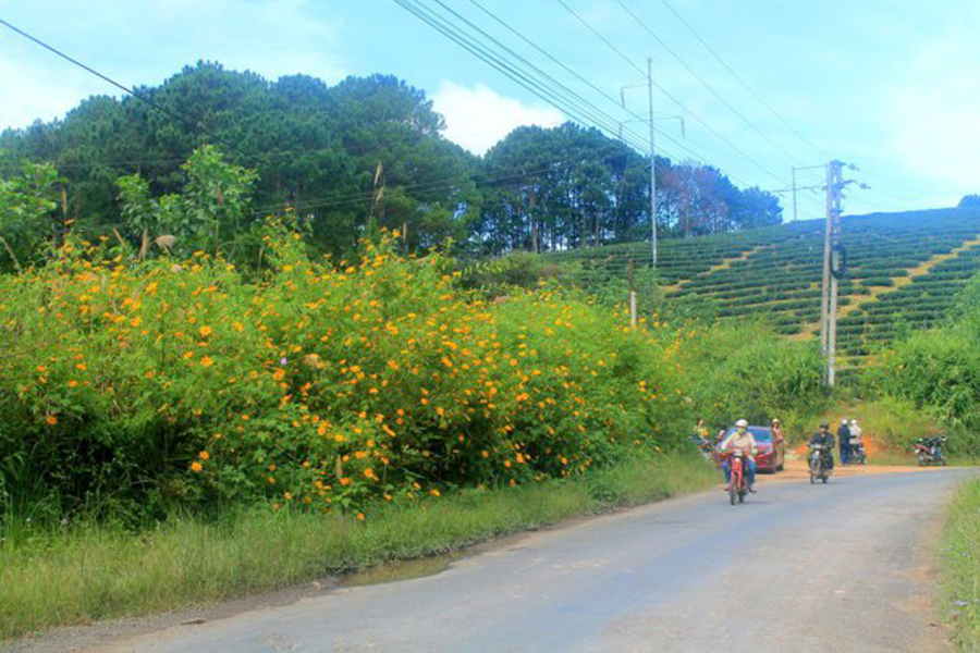 Đặc biệt, khu vực Tu Tra có nguyên một con đường dài, hai bên đầy ắp dã quỳ vàng nhuộm cả con đường, tạo nên bức tranh thơ mộng, say đắm.