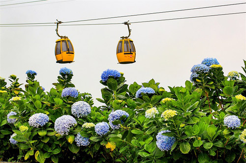 Tràn ngập trên mọi nẻo đường khu du lịch Bà Nà là hình ảnh những bông cẩm tú cầu tựa như những quả cầu đổi màu ngoạn mục, với đường kính chừng 30cm. Khác với những nơi khác, cẩm tú cầu tại Bà Nà Hills chuyển màu diệu kỳ theo từng giai đoạn. Lúc non tơ là xanh lá mạ, khi sung mãn với màu xanh kem và bung nở dịu dàng trong sắc tím..