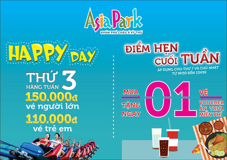 “Happy Day” là chương trình ưu đãi đặc biệt giảm 25% giá vé, duy nhất vào thứ 3 hàng tuần cho tất cả du khách đến tham quan Asia Park. Với Happy Day, giá vé tham quan Asia Park dành cho người lớn còn 150.000 đồng; trẻ em từ 1m-1m3 là 110.000 đồng và trẻ em dưới 1m được miễn phí.