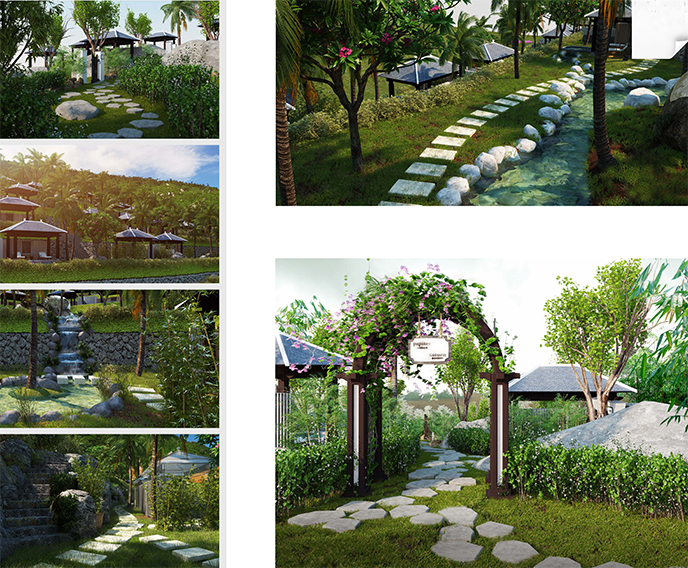 Cảnh quan ra vào các khu được trang trí đẹp mắt với các cổng chào, lối đi được lát đá cubic.