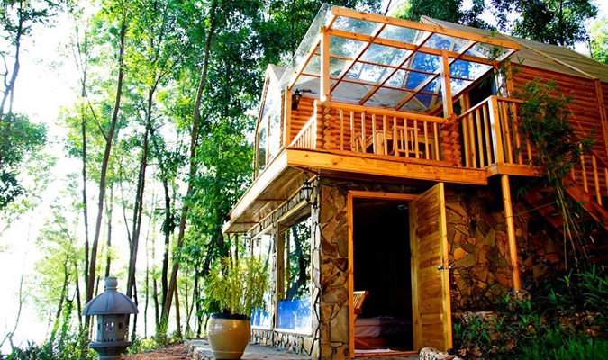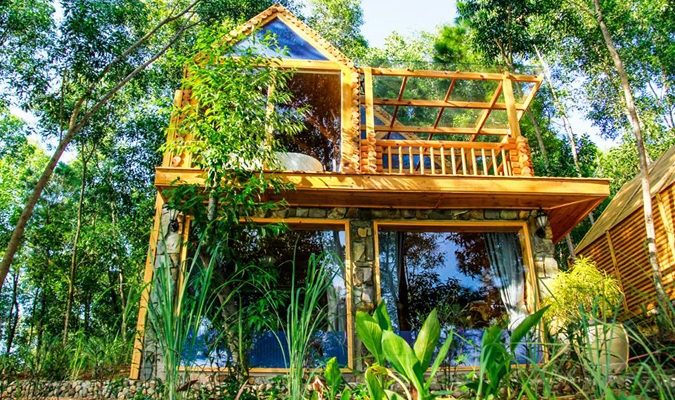 Hệ thống phòng nghỉ ở đây là những ngôi nhà bằng gỗ lạ mắt và tinh tế. Có 3 loại phòng cho bạn lựa chọn: phòng có view nhìn ra vườn cây xanh, tạo cảm giác dễ chịu, khoan khoái; phòng view bờ sông lộng gió cho bạn trải nghiệm những cảm giác khó quên; phòng gia đình thoáng mát và yên tĩnh, thích hợp cho việc sinh hoạt và nghỉ ngơi của cả nhà. Ngoài ra, với những du khách một được hòa mình trọn vẹn vào thiên nhiên thì có thể thuê những chiếc lều để nghỉ ngơi.